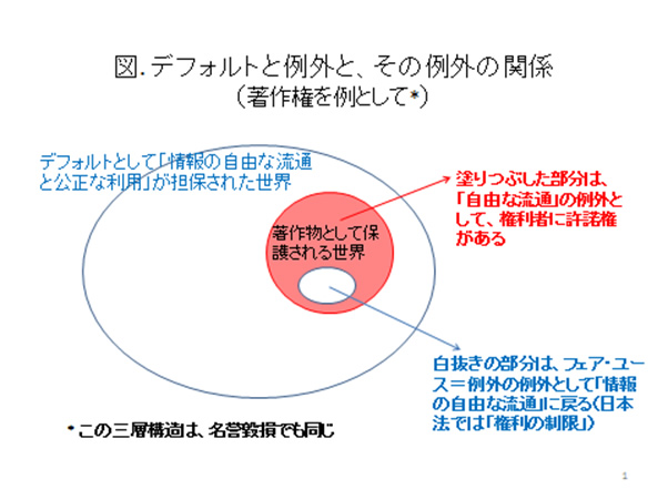 わが国の法制では「フェア・ユース」と呼ばず、「権利の制限」と呼んでいますが、「インセンティブを付与するために一定期間の排他的利用を認める」という著作権法の原則に対して、その「権利を(文字どおり)制限する」と考えれば、図が示すところと全く同じ構造です。このような枠組み(今風に言えば architecture)を理解することが、情報に関する権利設定を考えるための第一歩となることは、間違いないでしょう。