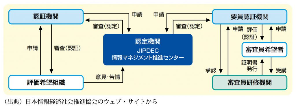 これは、企業等が構築した情報セキュリティに関する手続きが、JIS Q 27001(ISO/IEC 27001)に適合しているかどうかを第三者が審査し登録する仕組みです。その中心となる機関は「認証機関」と呼ばれますが、それ以外にも、審査員の資格を付与する「要員認証機関」、さらにこれらの各機関がその業務を行なう能力を備えているかどうかをみる「認定機関」があり、それぞれが自己の信頼性を第三者の評価に委ねています(図 参照)。ただし、審査員になるための研修を実施する「審査員研修機関」は、要員認証機関が自身で承認しています。