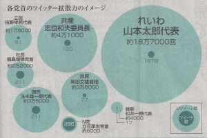 ツイッターに投稿した回数自体が、山本太郎167回、志位和夫120回、岸田文雄77回などと山本太郎が圧倒的だった面もあるし、転載は支持者間だけに止まっている傾向も強く、これらの数字が主張が広がったという意味での「拡散力」を示しているとは必ずしも言えないけれど、ネット空間におけるある程度の人気のバロメーターにはなっているだろう。