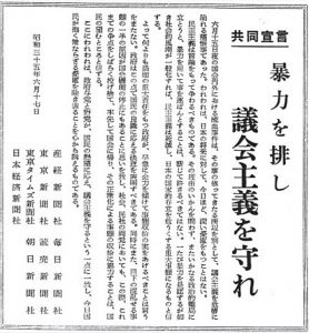 B ここにはマスメディアのいわゆる「客観報道」の問題点が凝縮しているとも言えます。古くは 60年安保当時の7社共同宣言が反対デモによる死傷者発生を機に「暴力を排し議会主義を守れ」との見出しを掲げ、「その事の依ってきたる所以は別として、議会主義を危機に陥れる痛恨事であった」と、結果的に安保闘争を鎮静化させた例があるけれど、やはり「事の依ってきたる所以」を捨象して「混乱する議会」の正常化を叫んでも、解決にはならないですね。若い市長によって大手新聞社が批判されたと言うので、この安芸高田市制作の動画が再生回数100万回というヒットになりました。