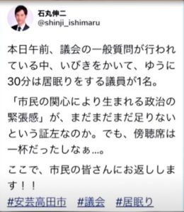 B 話が〝面白く〟なるのは、彼が市長になってからです。初登庁後の市議会一般質問で、市議の1人がいびきをかいて寝ていたので、彼はいきなりツイッター(今はⅩと名を変えているが、以下ツイッターの旧名を使用)で、それを公開します。これが市長vs市議会のスタートですが、市議会でツイッターをやってる市議はほとんどいなかったらしく、ツイッターを見た報道陣がこの件について市議会議長に問い合わせると、議長は「居眠りがどうした?」と言ったかどうかはともく、居眠り議員を擁護すると同時に、議会内の出来事をSNSで発信した行為に対して市長不信を強め、徹底抗戦の姿勢を取り始めます。議会は本来公開されているものだから、それをツイッターで書いたから問題だということはないんだけれど、議員連中が驚いたのはわからないでもないですね。