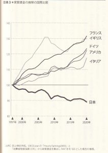 実質賃金の推移の国際比較(出典・井上伸氏作成)で、グローバリズムの中でも、フランス、イギリス、ドイツ、アメリカ、イタリアとそれぞれ伸びているのに、日本だけが低迷しています。起点は1997年。終点は2020年。日本が先進国のなかで最も「賃金抑制」に成功した理由は、1990年半ば以降、徐々に企業・労働者の交渉力を企業に有利な方向に変化させてきたことにあるというエコノミストの見解を紹介し、「企業利益にそぐわないものは企業の外にだし労組の圧力が及びにくい仕組みを築いてきた企業政策の結果の賃金デフレだ」と述べています。