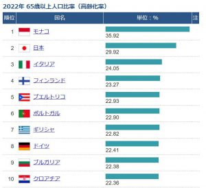 これは2022年の段階でモナコに次いで2位である(グローバルノート – 国際統計・国別統計専門サイト)。しかも国立社会保障・人口問題研究所の推計によると、2040年には総人口の34.8%になるという。