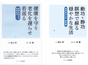 あしかけ4年余りをかけて禅密気功の動功編、および静功編について、朱剛先生のお話を聞きながら、自分なりの実践結果をまとめてきた。執筆、編集、レイアウトまですべてが自作で、書籍流通ルートを介さないアマゾンだけの販売である。第1作が東山明『健康を守り 老化を遅らせ 若返る』(2019)、第2作が東山明『動功+静功 瞑想で蘇る 穏やかな生活』(2023)で、サイバー燈台叢書(サイバーリテラシー研究所刊)の一環である。このたび会報に執筆の機会をいただいたので、よしなしごとを書かせていただいた。