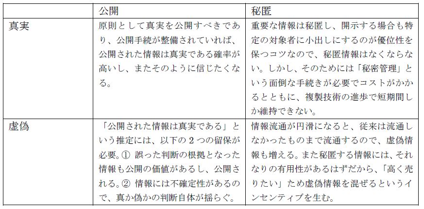 それでは、情報の公開―秘匿の軸と、真実―虚偽の軸とを組み合わせてみると、どのような知見が得られるでしょうか? 次の表はそれを簡潔にまとめたものです。