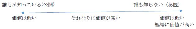 そこで、情報の価値のスぺクトラムを次のように描けば、左端の価値は低く、右端の価値は低いものと極端に高いものに分かれ、中間の価値はそれなりに高いということになりそうです。