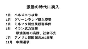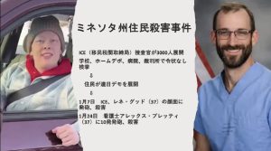 最初にトランプ政権下でいま何が起こっているのかを「ミネソタ州住民殺人事件」を通してお話しします。これは今年1月にカナダ国境に近いミネソタ州で移民関税取締局(ICE=アイス)の連邦職員によって住民が2人殺害された事件です。トランプ政権はミネソタ州で武器を携行したICEによる集中的な「不法滞在」移民の取り締まりを進めており、それに対する抗議デモも盛んでした。今年1月7日、デモに参加していた女性のレネ・グッドさんが顔面に発砲されて死亡、24日に男性看護士のアレックス・プレッティさんが、職員ともみあいになっているときに10発発砲され、やはり死亡しました。デモには「不法滞在」者のみならず、ふつうの市民も多く参加していましたが、その中で2人が殺害される事件が起きたわけです。