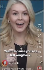 いて追及しましたが、キャロライン・リービットという若い女性報道官(写真)は「あなたは左翼的な意見をもつ偏向した記者‣‣‣だって、あなたは左翼のブン屋(hack)ですから」とか「あなたとメディアの連中は、偏向していながら、ジャーナリストのように偽っている。その席に座るべきではない」とまで言っているんですね。私がその席にいたら、ショックで頭が破裂しそうだと思いましたが、とにかく恐ろしい環境です。このような彼女のメディア攻撃は毎日、午後1時からの定例会見で繰り広げられており、その中で記者は抵抗しているのが現状です。