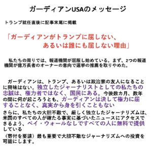 トランプ大統領第2次政権スタート直後に配信されたニュースの最後に上記のメッセージが記されていました。「私たちの周りでは、報道機関が屈服し始めている」とある2つのメディアは、はワシントン・ポストとロサンゼルス・タイムズです。ワシントン・ポストはオーナーのジェフ・べゾス、ロサンゼルス・タイムズはハゲタカファンドの傘下にあります。2紙は従来民主党候補を推薦していましたが、2024年選挙ではそれをやめました。ワシントン・ポストはそのためにデジタル購読者30万人が購読を取りやめています。購読者の新聞に対する愛着心が強いことがよくわかります。