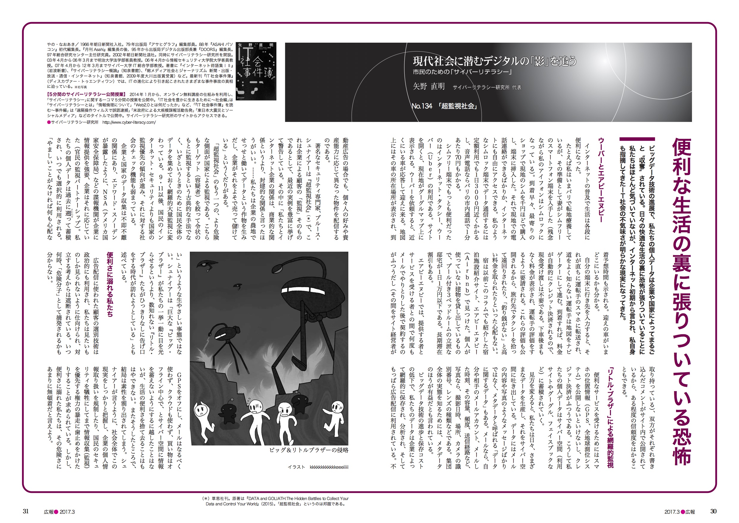 ビッグ&リトルブラザーの侵略で人びとが逃げまどっていますね。後のコラムでは、社会として、それに抗うことの重要さを一つの司法判断を通して紹介したけれど、結局、記事はそれを蹴散らさんばかりに進む監視の動きへと移行した。イラストもそうだね
