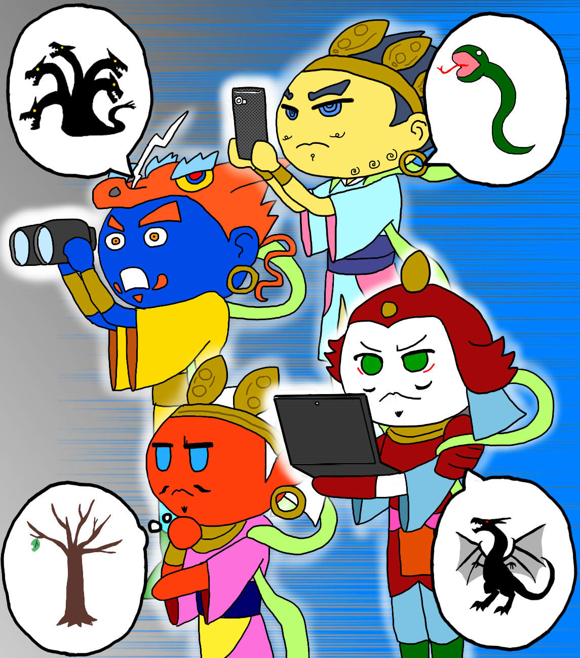 多聞天(顔色は黄)は尻尾だけ見て「蛇」と判断し、持国天(蒼白)は顔を見て「竜(ドラゴン)」と判断しました。全体像をとらえたかと思われた増長天(青)は、被写体に近づきすぎて「ヒュドラ(八岐大蛇)」に見えました。広目天(赤)には「枯木」が見えています。
