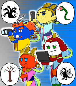 今回のコンセプトは、「見る者によって異なる実態(真実)」です。画像のキャラクターは、持国天・増長天・広目天・多聞天のいわゆる四天王です。日本にある仏像の四天王は表情が違うものの、外見がよく似ているので、中国北京妙応寺の四天王をベースにしています。表情は東大寺四天王像を参考にしました。