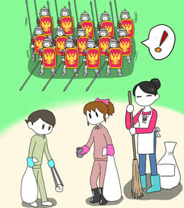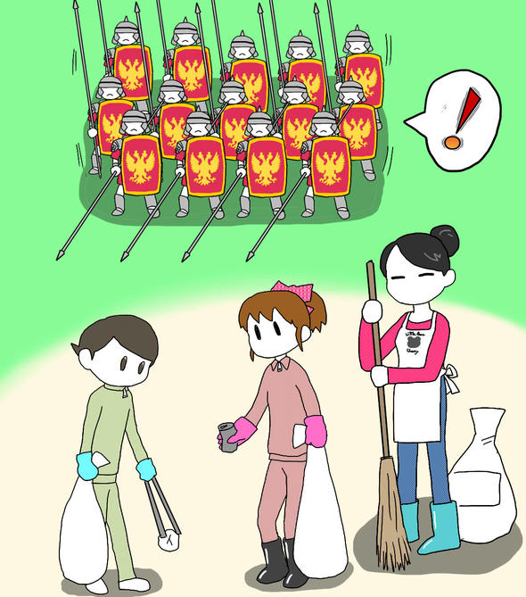 記事にある縦社会を表現していますが、タテ→盾という連想から思いつきました。タテ社会というダジャレに至らなくても、ローマ帝国(古代の兵隊=絶対的縦社会の集団)が重武装ながら躊躇している絵として見えればよいかなと。