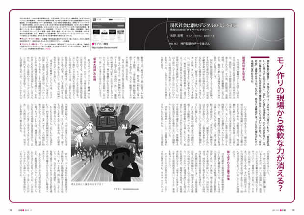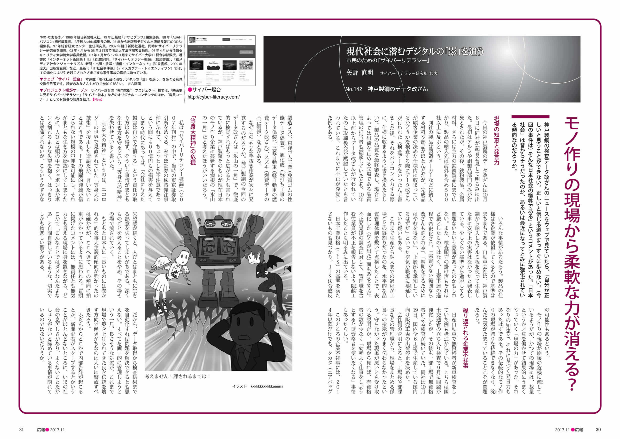 ところで、本原稿で<神戸製鋼の今回のデータ改竄は「氷山の一角」で、徹底的に検査すればもっと広がるとも言われているが、神戸製鋼そのものが現在日本のモノ作り企業に蔓延する病根の「氷山の一角」だと考えた方がいいだろう>と書いているわけだが、案の定というべきか、直後にスバルの無資格検査、最近では三菱マテリアル子会社の検査データ改竄が発覚しており、まさに全体構造を見据える目が必要になっていますね。これぞサイバーリテラシー、ジャンジャン(^o^)。