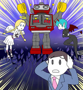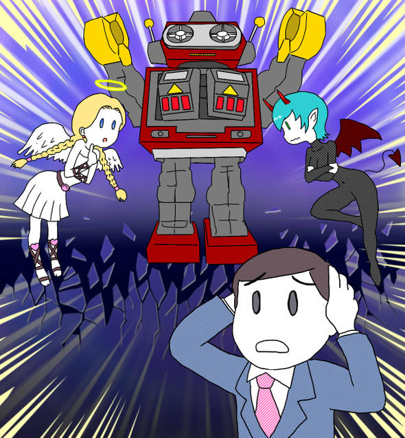 良心・悪意が葛藤しているシーンのステレオタイプといってもいい天使と悪魔の囁き(あるいは戦い)ですが、第三勢力としてロボットが登場しています。かつての大ヒットおもちゃの火星大王をイメージしました。