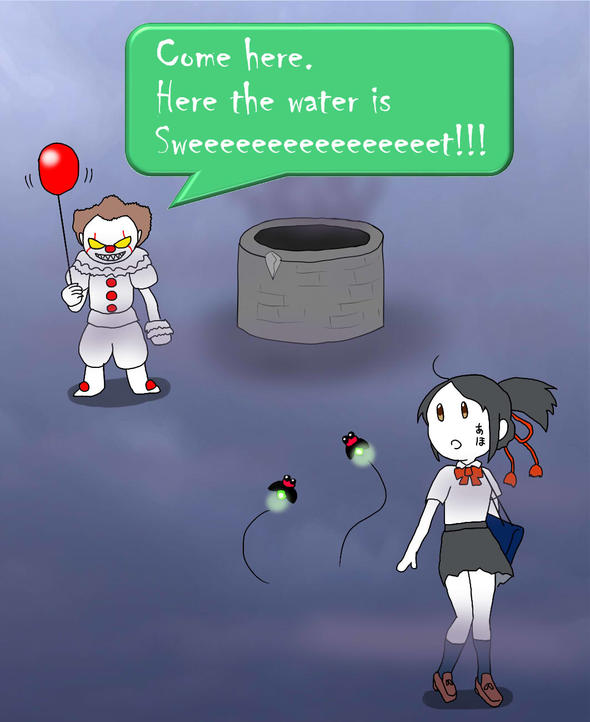 イラストに戻りますが、ペニー・ワイズの傍らには井戸があります。映画で井戸はペニー・ワイズのアジトに通じる入口なのですが、イラストではイド(無意識)の暗示も兼ねています。井戸(イド:無意識)からは、よく見ると不穏なモヤモヤが吹出していますが、無意識からの危険意識、あるいは既に取り込まれてしまった人の後悔の念としてもいいと思います。明らかに甘そうではない怪しい井戸の水を、「Sweet Water」と言っているので、これもフェイクニュースですね。