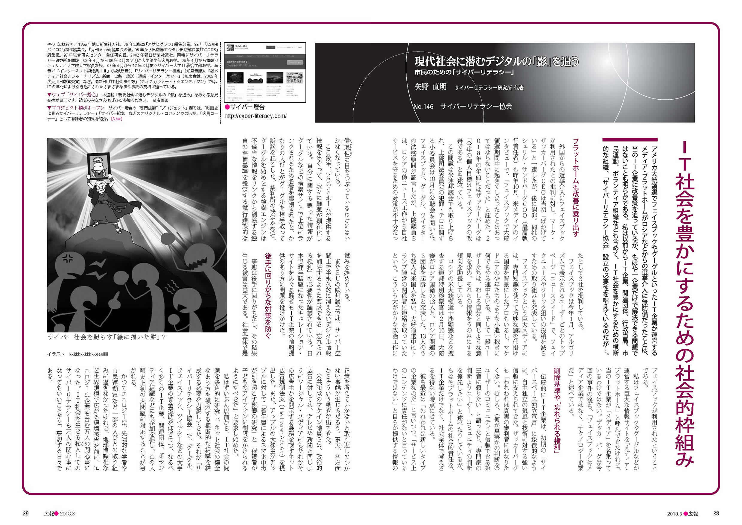 ところで、146回は145回の続編です。フェイスブックを中心にプラットホーム側の動きをフォローしつつ、持論のサイバーリテラシー協会について書いています。