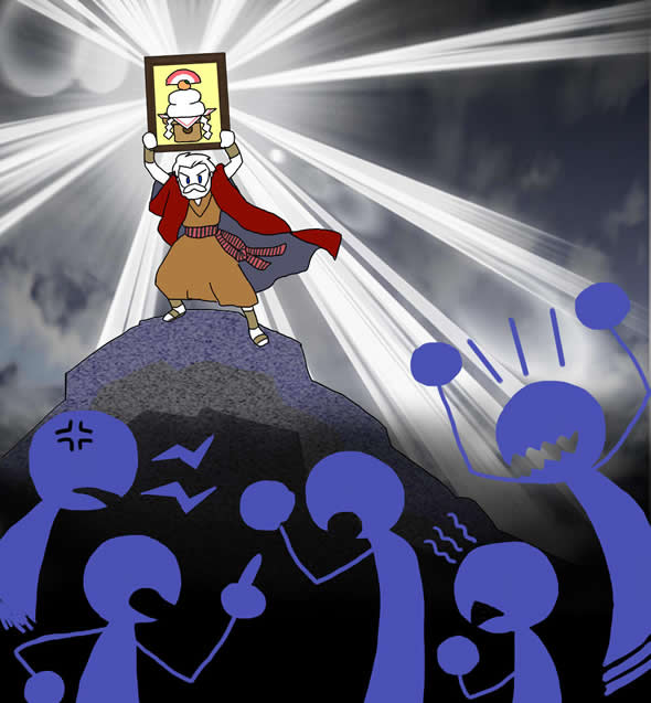 言い争い混沌とした人々(社会)。モーセが掲げる「絵に描いた餅(理想)」=サイバーリテラシーが、サイバー社会を照らす光となってほしい……そんな思いが籠っています。