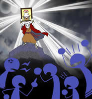 そんな「絵に描いた餅」が、言い争う人たちを照らしている――そんな構成となっています。イラストのモチーフは、「十戒」(1956年 アメリカ映画)です。映画のポスターでは十戒の石板(タブレット)を掲げていますが、イラストでは「絵」を掲げました。理由は上記の通りです。イノベーションを起こす「高き理想」のみが、今のサイバー社会を照らすものだと信じているからです。