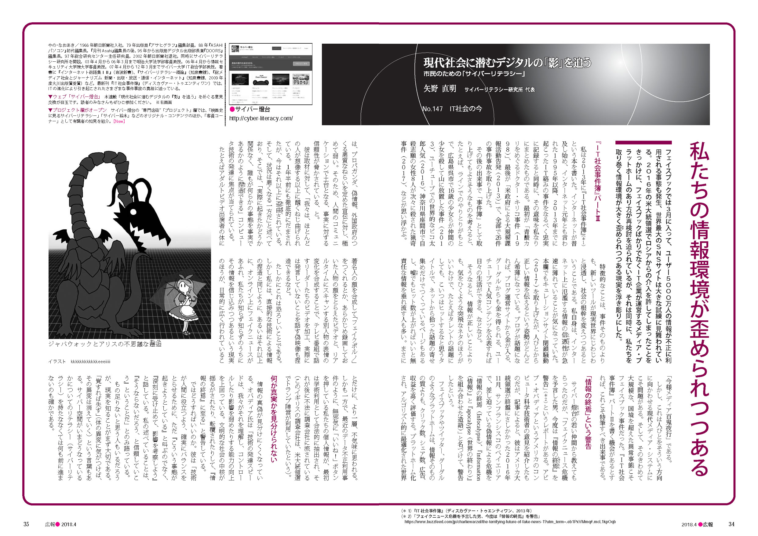 首が長いジャバウォックは、アリスに対して首を大きく捻じ曲げていますが、これは醜く歪んだ情報を表現しています。本来、そういった混沌(ジャバウォック)とアリス(少女)は、住む世界が違うために遭遇することはありません。サイバー世界では、ソレを可能としてしまう怖さがあります。また、アリスは傘をさしています。カラー版の背景は怪しい花が咲き乱れるバージョンです(これが第一稿です)。空に魚が泳いでいるので、傘は意味不明な世界の「せめてもの」防御策という象徴だったのですが、この背景をモノクロにすると、挿絵としてはゴチャゴチャしすぎと感じたので、雑誌に掲載したのはグリッド(格子)背景としました。