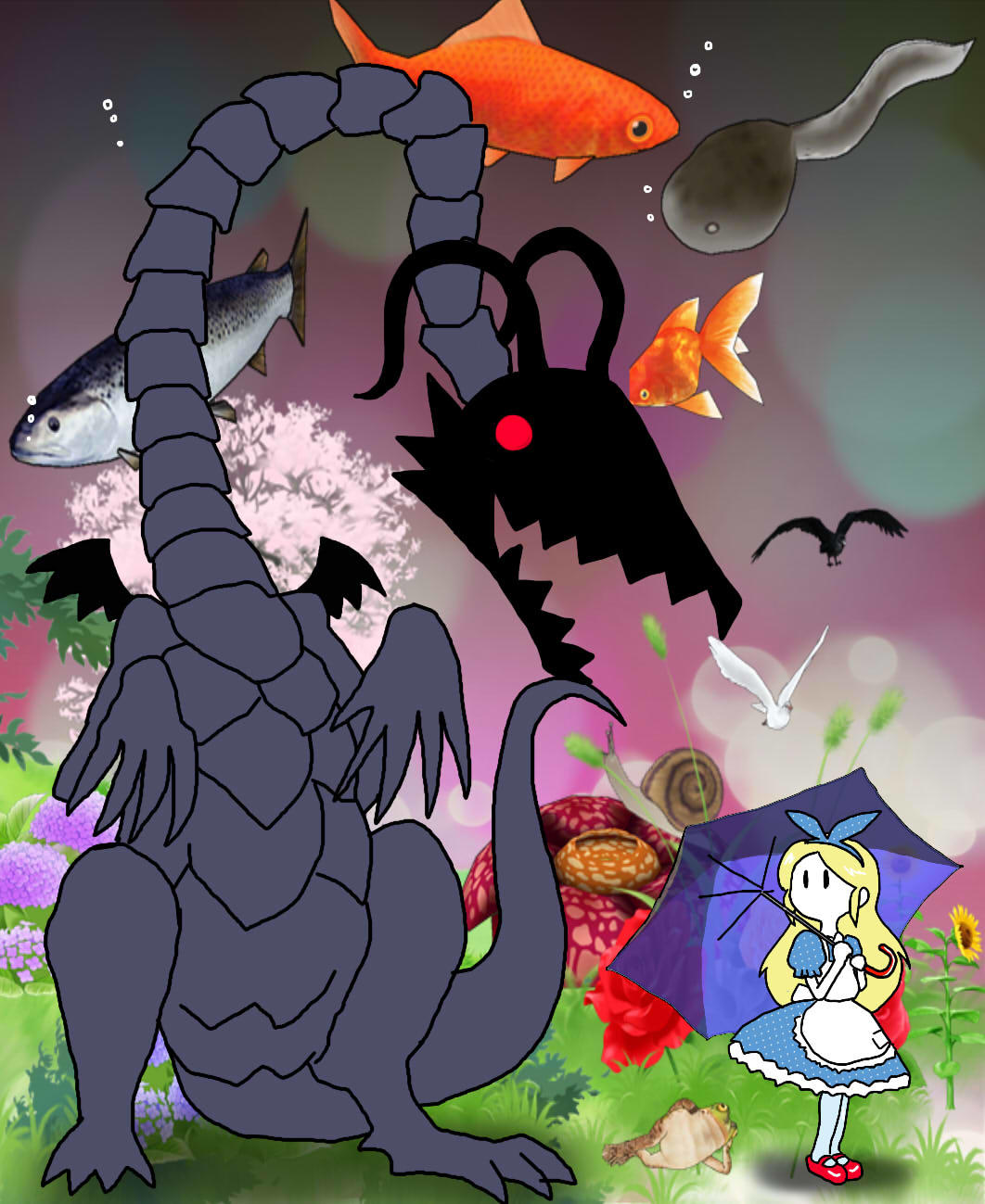 でも、かばん語ごとき(失礼)にアレコレ言っていた人たちは、現代のネット語を見たら卒倒してしまうかも知れませんね。まあ単純に、不思議の国(ワンダーランド=サイバー世界)で迷うアリスと、遭遇した(してしまった)ジャバウォック(醜く歪んだ情報の化け物)のイラストとしてもよいかな、と。