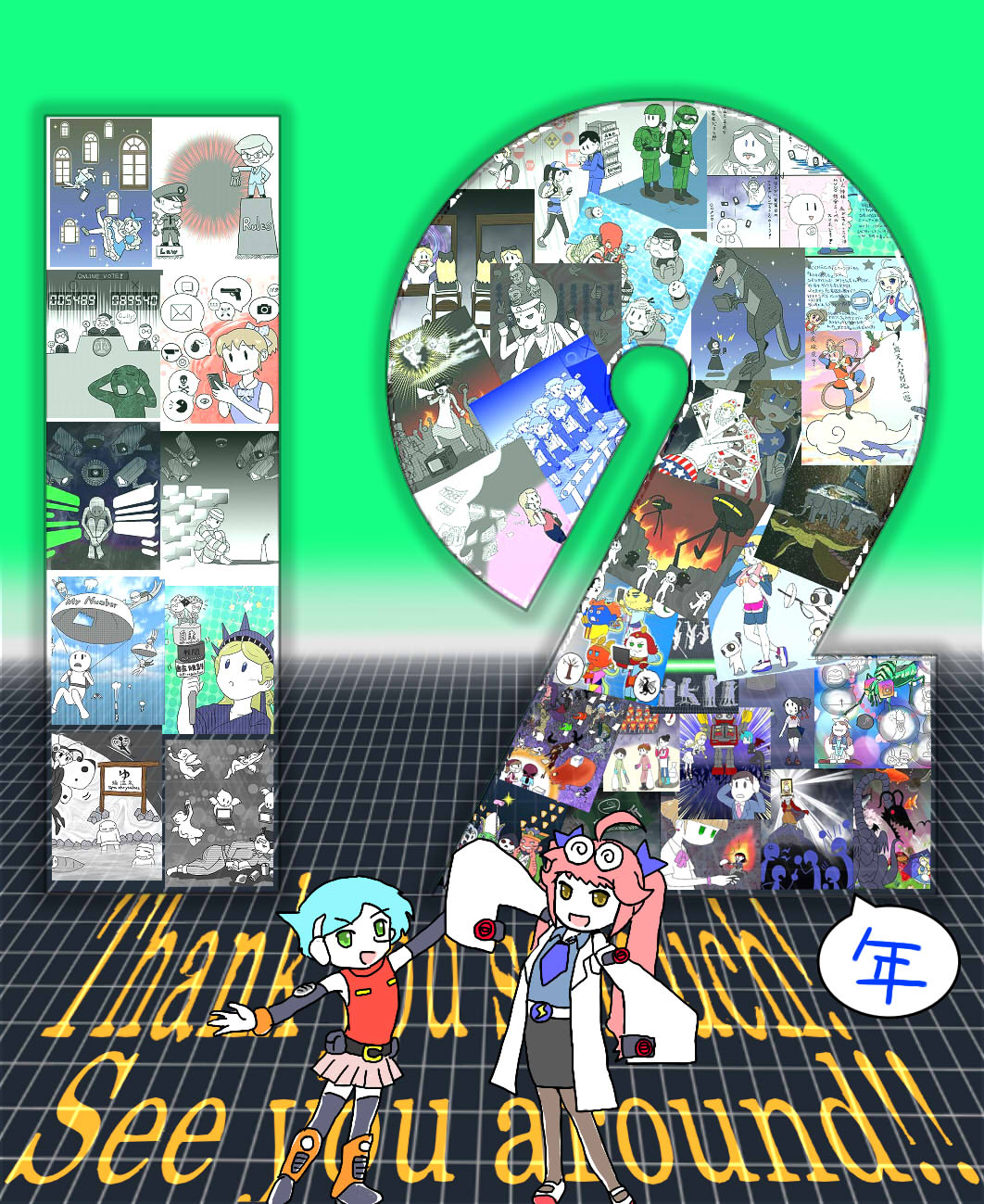 当時は、完成のイメージはあるものの、手順をどうしたらいいか悩んだり、結局いい方法が思いつかずに、思いっきりアナログ手法に頼ったり…… グレースケール加工で絵が潰れてしまい、結局丸々描き直しをしたりもしました。今ではよい思い出です。アドビのイラレも持っていたのですが、作成工程もネタになると思い、ベクター画像をWordで作ったり、お世辞にも効率的な生産工程とは言い難い、悪あがきみたいなことばかりでしたね。おかげで「絵描き」ではなく、画像編集のスキルばかりがあがったような気がします(^o^)。